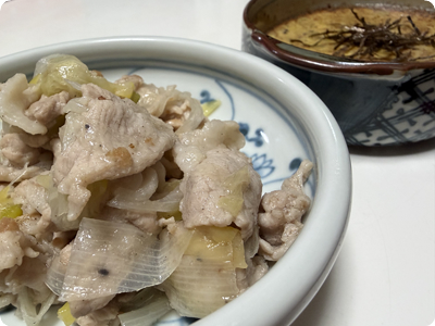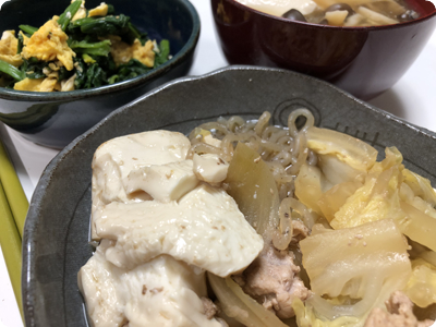 | ・豚こまと白菜の肉豆腐 ・ほうれん草とたまごのふんわり炒め ・きのこと豆腐のとろみスープ ・ごはん |