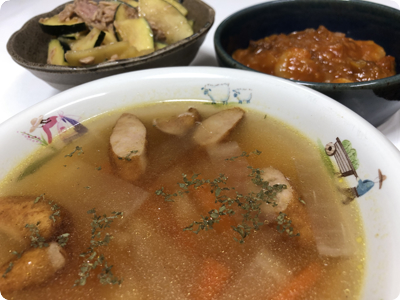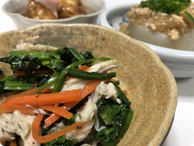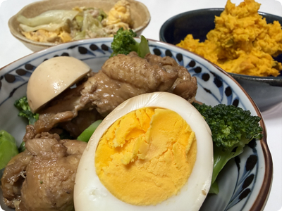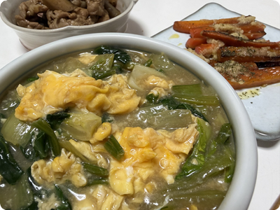 | ・青梗菜と卵のオイスターあんかけ ・ごぼうと豚肉の甘辛煮 ・にんじんソテーのガーリックソースのせ ・ごはん |