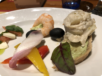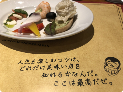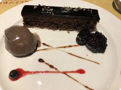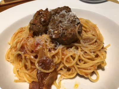 | USJパーク内「リストランテ・アモーレ(アズーラ・ディ・カプリ)」にて ・前菜 ・ミートボールスパゲティ ・甘い罠 ・スパイスチョコレートケーキ~チョコアイスとブラックベリーソース添え~ |