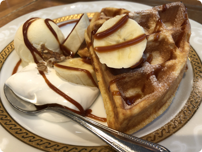「スイーツナチュラルカフェ 紙屋町パーラー」にて キャラメルバナナのワッフル(ハーフ)&ホットコーヒー |