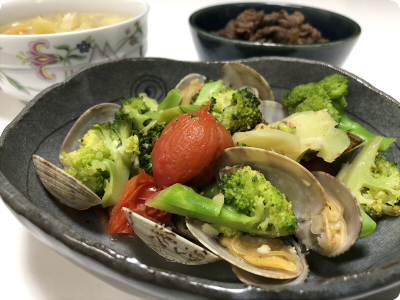 | ・あさりとブロッコリーのガーリック酒蒸し ・牛肉とごぼうのしぐれ煮 ・大根とキャベツのスープ ・ごはん |