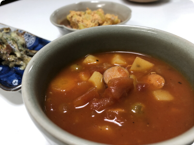 | ・トマトスープ(ミネストローネ) ・ししゃものチーズ焼き ・さつまいもと人参のツナサラダ ・ごはん |
