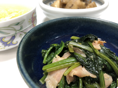 | ・ほうれん草のベーコンバター炒め ・里芋とコンニャクの炒め煮 ・炒めたキャベツの中華スープ ・ごはん |