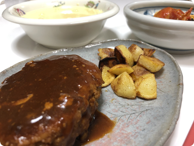 | ・チーズインハンバーグ ・トマトと木耳の卵炒め ・じゃがいものソテー ・コーンスープ ・ごはん |