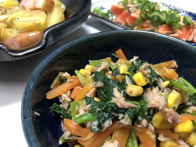 | ・ジャーマンポテト ・サーモンのたたき風和風カルパッチョ ・ほうれん草と人参のツナコーンサラダ ・ごはん |