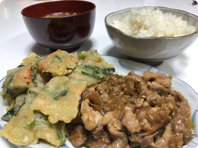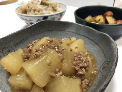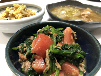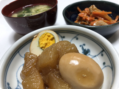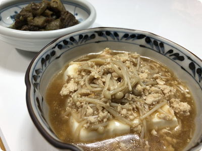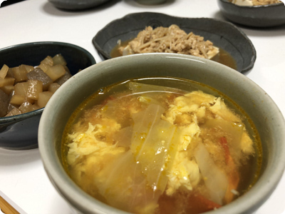 ・豆腐の鶏そぼろあんかけ ・ピリ辛ころころ大根とこんにゃく ・トマトレタス卵の3色スープ ・ごはん |