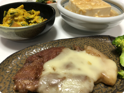 ・豚ロースのチーズポークソテー ・あんかけ豆腐 ・かぼちゃサラダ ・ナムル ・ブロッコリー ・ごはん |