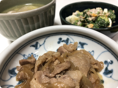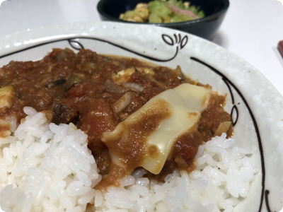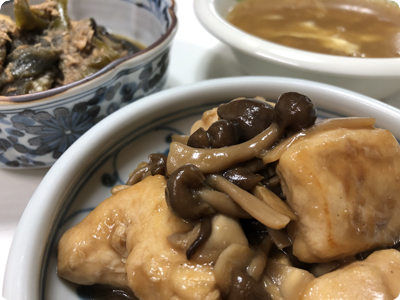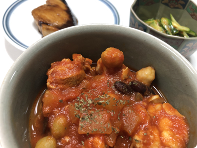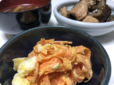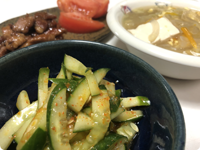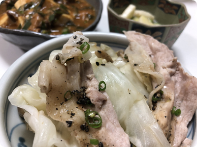 | ・サバの味噌煮缶でピリ辛麻婆豆腐 ・キャベツと豚肉の蒸し焼き ・長芋ときゅうりのぽん酢漬け ・ごはん |